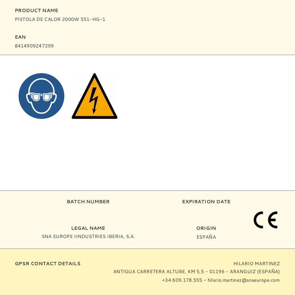 PISTOLA DE CALOR 2000W 551-HG-1. PANTALLA LED PARA AJUSTE DE TEMPERATURA 12 VALORES DE AJUSTE DE TEMPERATURA DOS OPCIONES DE FLUJO DE AIRE DIFERENTES: VELOCIDAD 1: 250 L/MIN 50°C, 100°C, 150°C, 200°C, 250°C, 350°C VELOCIDAD 2: 550 L/MIN 100°C, 200°C, 300°C, 400°C, 500°C, 600°C SISTEMA DE ENFRIAMIENTO AUTOMÁTICO: 280 L/MIN 50°C MODO MANOS LIBRES