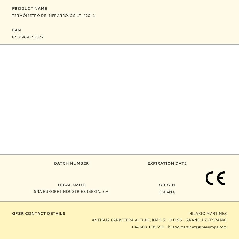 TERMÓMETRO DE INFRARROJOS. MIDE LA TEMPERATURA SIN CONTACTO. RANGO DE MEDICIÓN: DE -50 A 420°C ( -58 A 788°F). INCLUYE UN PUNTERO LÁSER. PRECISIÓN: DE 0 A 420°C, +/- 1,5%. DE -50 A 0°C, +/- 3%. RESOLUCIÓN DE 0,1°C. REPETIBILIDAD DE LA LECTURA DE 1% O 1°C. TIEMPO DE RESPUESTA: 500 MS. DISTANCIA HASTA EL PUNTO MEDICIÓN: DE L12 A D1. INCLUYE UNA BATERÍA DE 9V