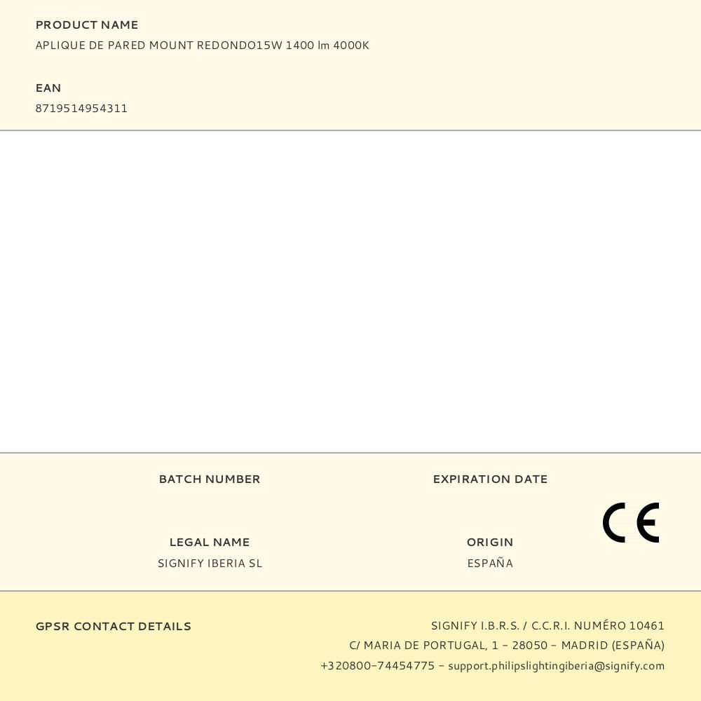 APLIQUE DE PARED REDONDO EXTERIOR 15W 1400lm 4000K PHILIPS. APLIQUE DE PARED MOUNT REDONDO 1400lm 4000K 15W IRC 80, 35000 HORAS IP65 911401861484 PHILIPS PROJECTLINE
