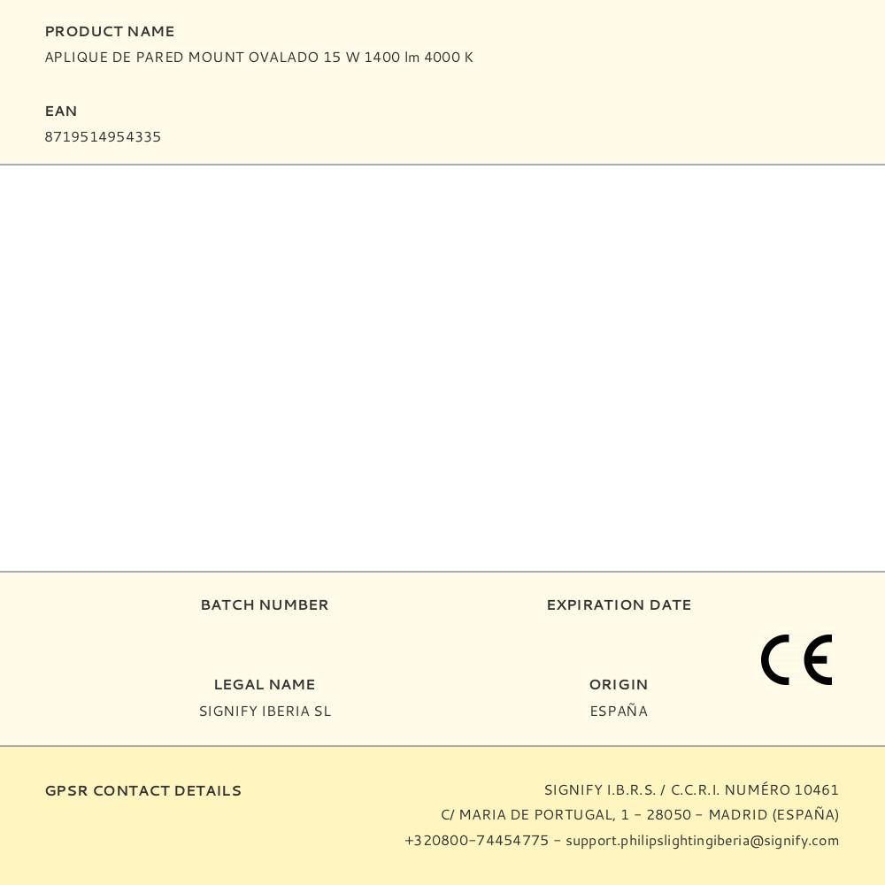 APLIQUE DE PARED MOUNT OVALADO 15W 1400lm 4000K PHILIPS. APLIQUE DE PARED MOUNT OVALADO 1400lm 4000K 15W IRC 80, 35000 HORAS IP65 911401861684 PHILIPS PROJECTLINE