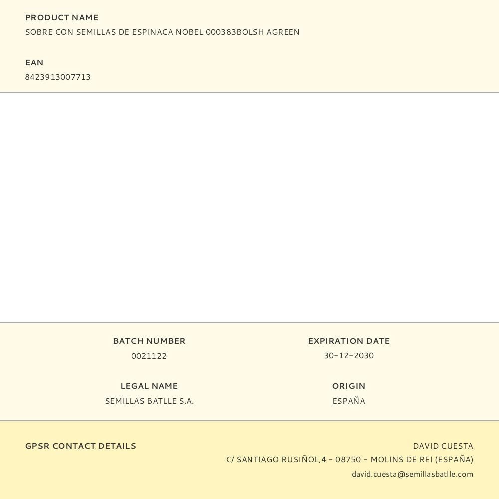 SOBRE CON SEMILLAS DE ESPINACA NOBEL 000383BOLSH AGREEN. DE HOJAS GRANDES Y CARNOSAS DE FORMA OVAL, RESISTENTE SUBIDA DE FLOR. IDÓNEA PARA EL MERCADO EN FRESCO Y CONGELADO.
