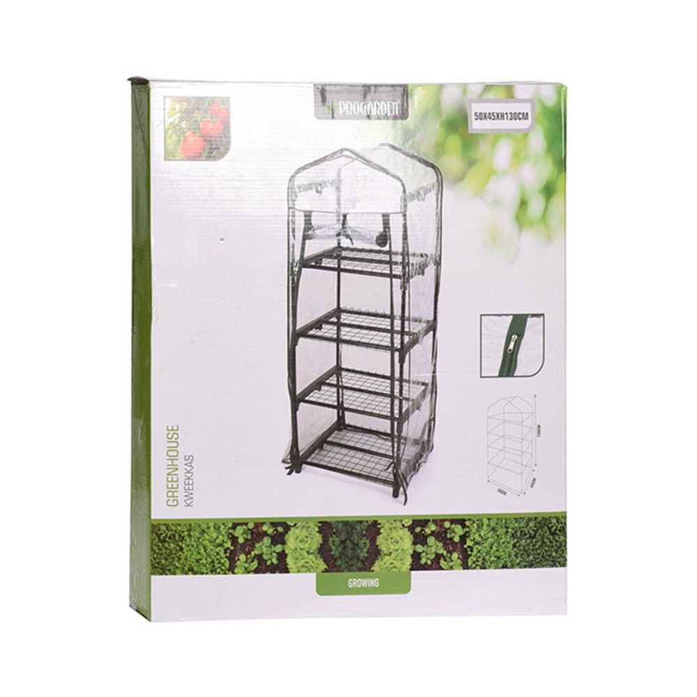 INVERNADERO DE 4 ALTURAS CON TEJADO 50x45x130cm (ancho/fondo/alto) PROTEGE TUS PLANTAS DE LAS HELADAS TARDÍAS DE LA PRIMAVERA, DEL FRÍO NOCTURNO Y DE CUALQUIER TORMENTA INESPERADA. CONSTRUIDO CON DURADERO PVC TRANSPARENTE CON UNA ESTRUCTURA DE ACERO, ESTE INVERNADERO ES RESISTENTE Y ESTABLE. SUS CUATRO ESTANTES TE PROPORCIONAN ESPACIO SUFICIENTE PARA MACETAS DE FLORES, HIERBAS AROMÁTICAS O ESPECIAS Y SEMILLAS DE TOMATERA.