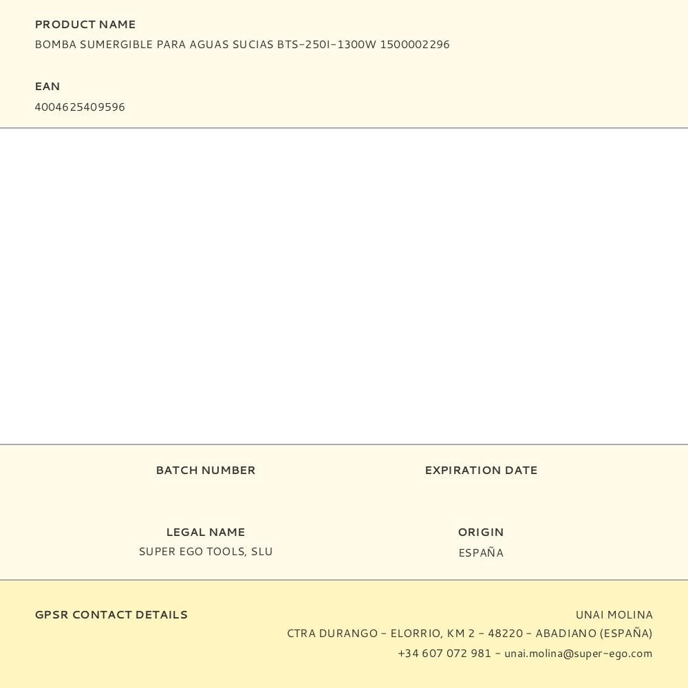 BOMBA SUMERGIBLE PARA AGUAS SUCIAS BTS-250I-1300W 1500002296 SUPER-EGO. PARA EXTRAER AGUA DE DEPÓSITOS Y POZOS DE HASTA 7 METROS DE PROFUNDIDAD, ADEMÁS DE USARSE EN RIEGO MANUAL Y AUTOMÁTICO. PARA SU USO CON AGUAS USADAS QUE CONTIENEN PARTÍCULAS EN SUSPENSIÓN, AGUAS DE FILTRACIONES O ESTANCADAS. CARACTERÍSTICAS: CARCASA CON DISEÑO ESPECIAL RESISTENTE A LOS IMPACTOS. CONEXIÓN EN LA MANGUERA EN LA PARTE SUPERIOR. EQUIPADAS CON: INTERRUPTOR DE BOYA PARA DETECTAR EL NIVEL DEL AGUA. CUERDA PARA UNA FÁCIL RECUPERACIÓN DE LA BOMBA. FACILIDAD DE CONEXIÓN GRACIAS A LOS 10M DE CABLE QUE INCLUYE. ASA QUE FACILITA SU TRANSPORTE Y USO EN CUALQUIER LUGAR. DATOS TÉCNICOS: CAUDAL: 22.500 L/H, POTENCIA: 1.300W, TENSIÓN: 230V / 50HZ, PARTÍCULAS: MÁX. Ø40MM, PROFUNDIDAD MÁX.: 5M, Tº MÁX. LÍQUIDO: 35ºC, ...