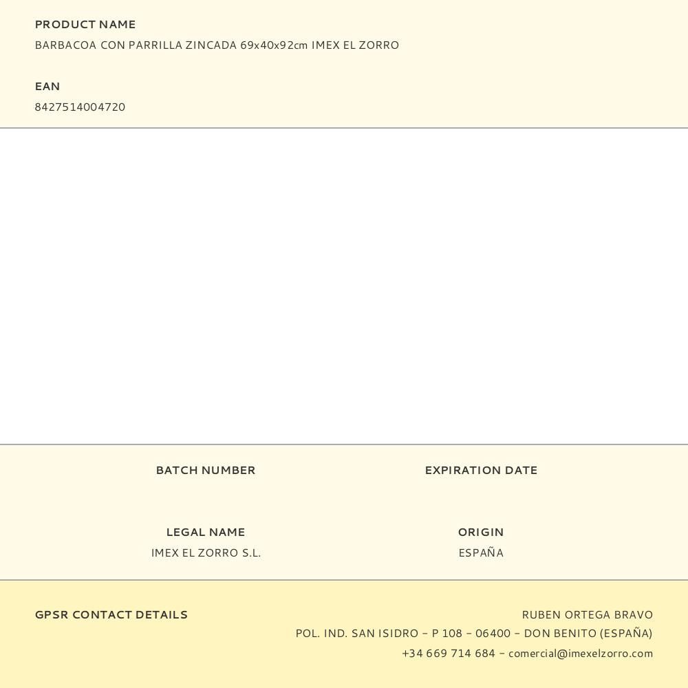 BARBACOA CON PARRILLA ZINCADA 69x40x92cm IMEX EL ZORRO. APTA PARA LEÑA Y CARBÓN.