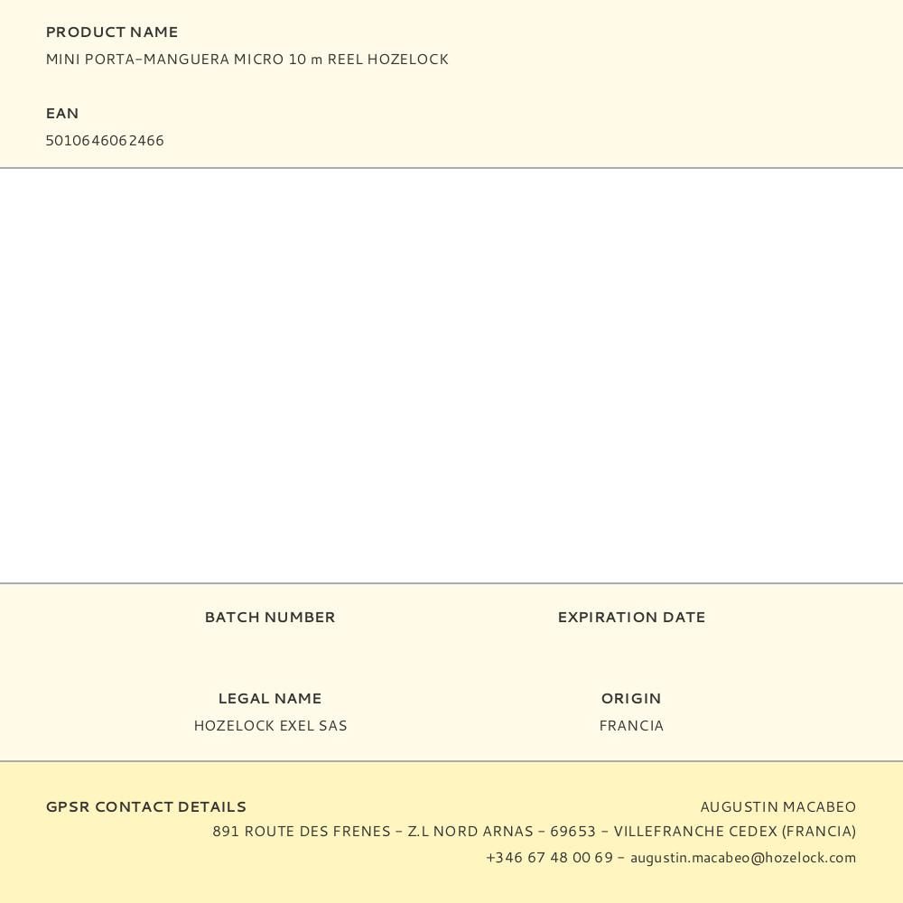 PORTAMANGUERA MICRO REEL 10 m. INCLUYE UNA MANGUERA DE 10 m Y ACCESORIOS. TIENE UN TAMBOR ROTATIVO CON MANGO PARA UN ALMACENAMIENTO RÁPIDO Y ORDENADO DE LA MANGUERA SIN ENREDOS Y SIN NECESIDAD DE DESENROLLARLA COMPLETAMENTE