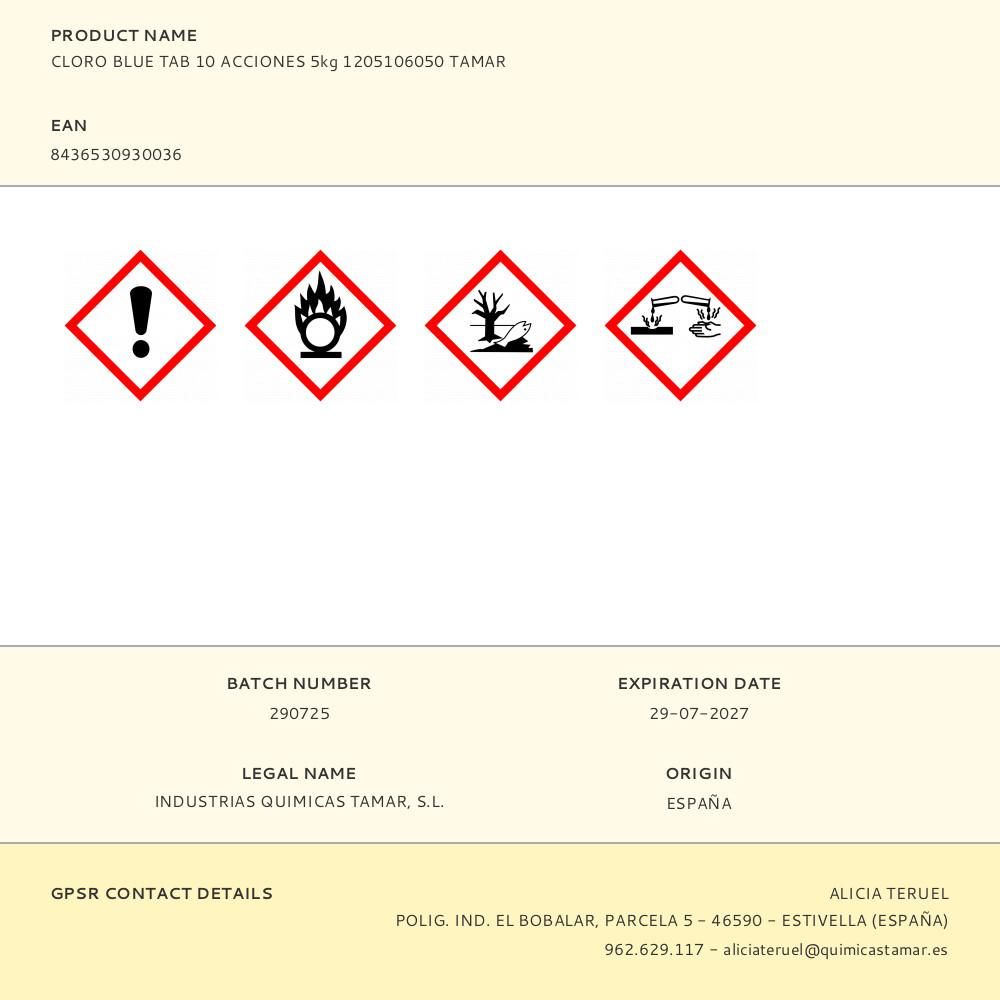 CLORO BLUE TAB 10 ACCIONES EN TABLETAS, BOTE 5 kg. PARA DESINFECCIÓN Y TRATAMIENTO DE AGUA DE PISCINA. TABLETAS DE 200 g