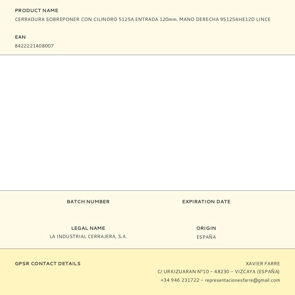 CERRADURA SOBREPONER CON CILINDRO 5125A ENTRADA 120mm. MANO DERECHA 95125AHE12D LINCE