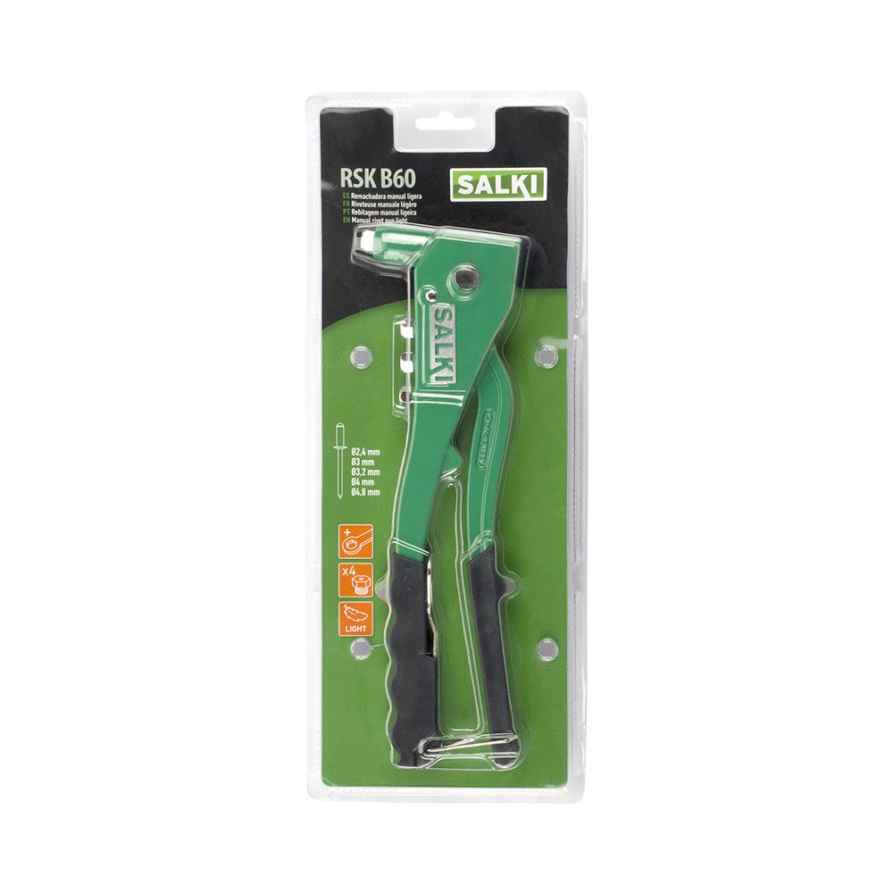 REMACHADORA B60 HOBBY MANUAL LIGERA. CONSUMIBLE: Ø2,4 - 3,2 - 4 - 4,8. CARCASA: CHAPA DE ACERO. CARACTERÍSTICAS: PALANCA EQUIPADA CON RESORTE DE APERTURA. MECANISMO AUTOMÁTICO Y SEGURO DE EXPULSIÓN DEL VÁSTAGO. INCLUYE: MORDAZAS INTERCAMBIABLES, LLAVE DE MONTAJE Y GANCHO CIERRE DE SEGURIDAD