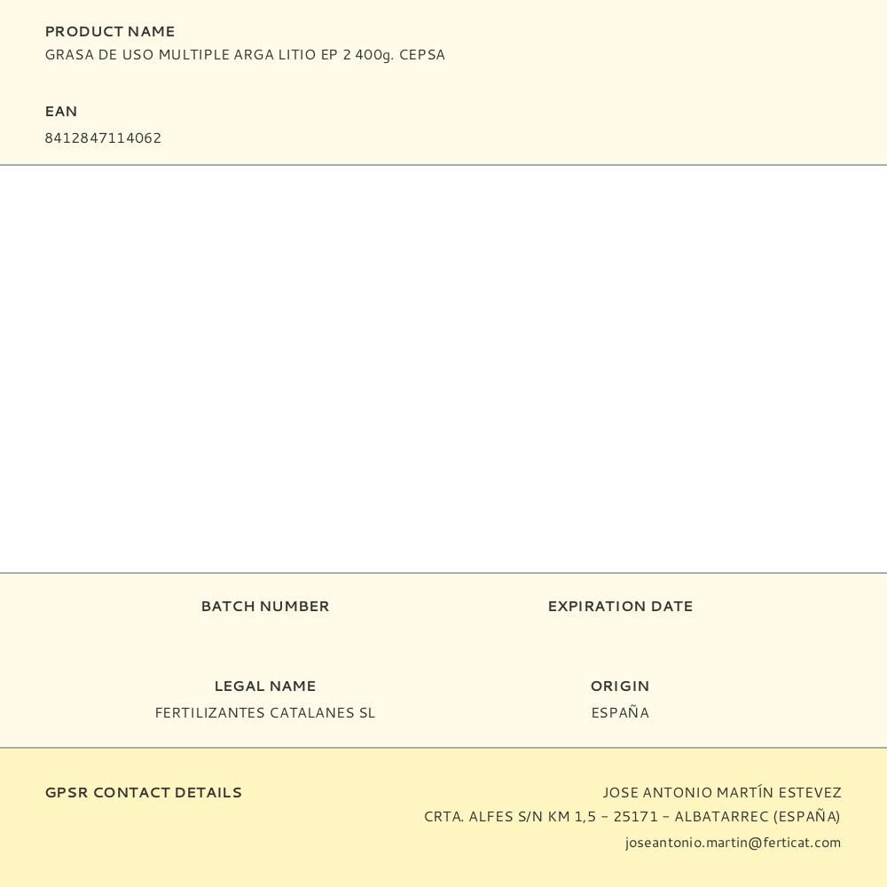 GRASA DE USO MULTIPLE ARGA LITIO EP 2 400g. CEPSA. PARA SU APLICACIÓN EN TODO TIPO DE RODAMIENTOS Y COJINETES PLANOS, SISTEMAS CENTRALIZADOS Y ENGRASADORES TECALEMIT, STAUFFER O A MANO, PARA EQUIPOS INDUSTRIALES, MARINOS O AUTOMOTRICES, SOMETIDOS A CARGAS ELEVADAS. BUENA PROTECCIÓN ANTIHERRUMBRE, ANTICORROSIVA, ANTIOXIDANTE Y ANTIDESGASTE. ALTAMENTE RESISTENTE A LA HUMEDAD Y PRÁCTICAMENTE INSOLUBLES EN AGUA. TEMPERATURA DE APLICACIÓN: -30ºC A +120ºC.