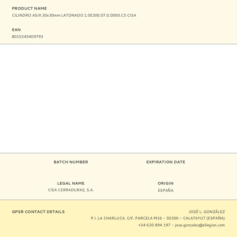 CILINDRO ASIX 30x30mm LATONADO 1.0E300.07.0.0000.C5 CISA CILINDRO ASIX 30x30 LATONADO CON SISTEMA DE 6 PITONES Y CONTRAPITONES CON LLAVE REVERSIBLE DE PUNTOS. 5 LLAVES