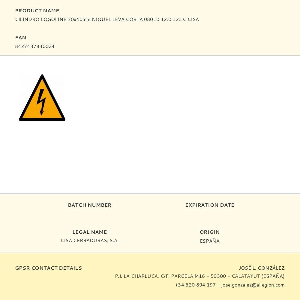CILINDRO LOGOLINE 30x40mm NIQUEL LEVA CORTA 08010.12.0.12.LC CISA CILINDRO LOGOLINE 30x40mm NIQUEL LEVA CORTA CON SISTEMA DE 6 PITONES Y CONTRAPITONES CON LLAVE DE SERRETA. 3 LLAVES