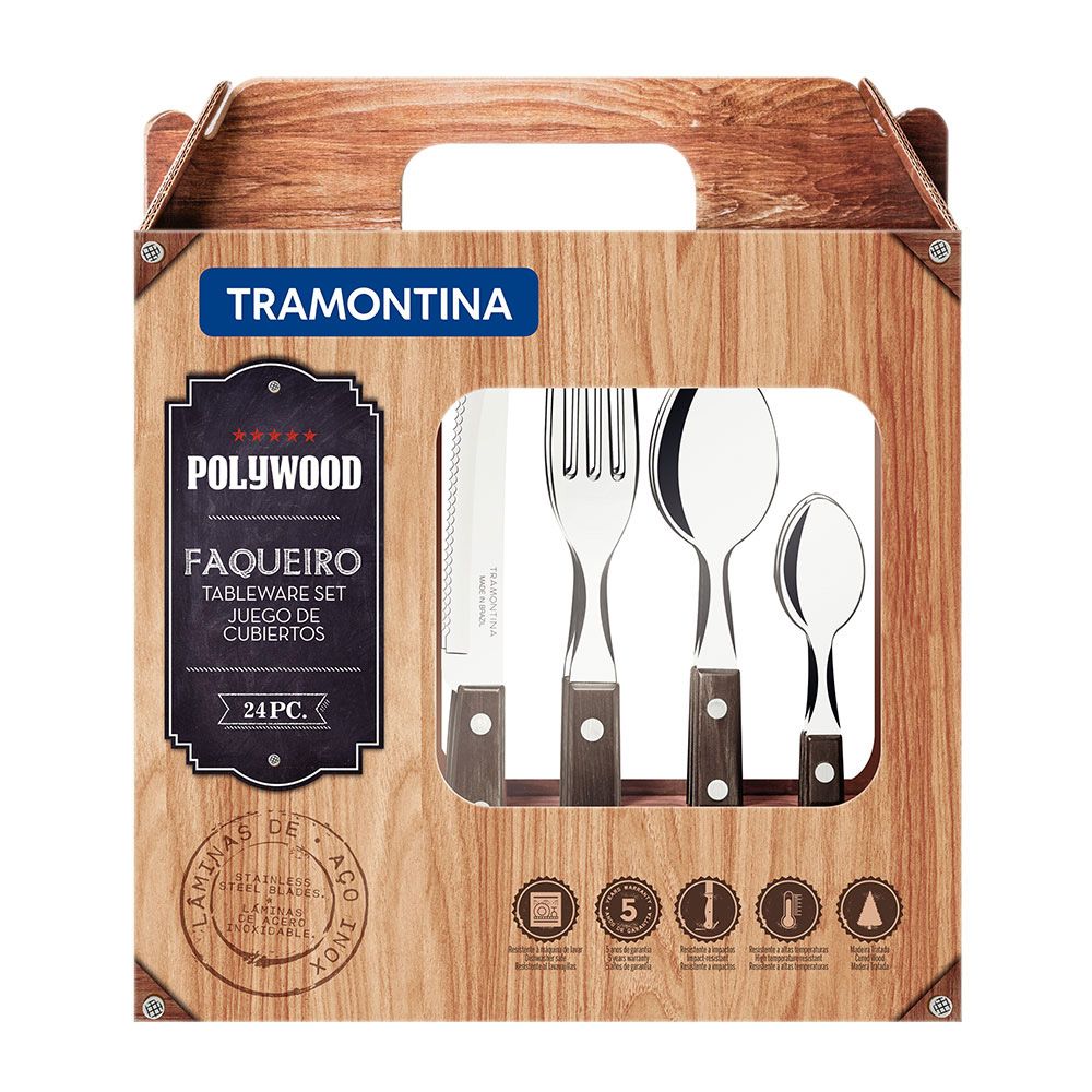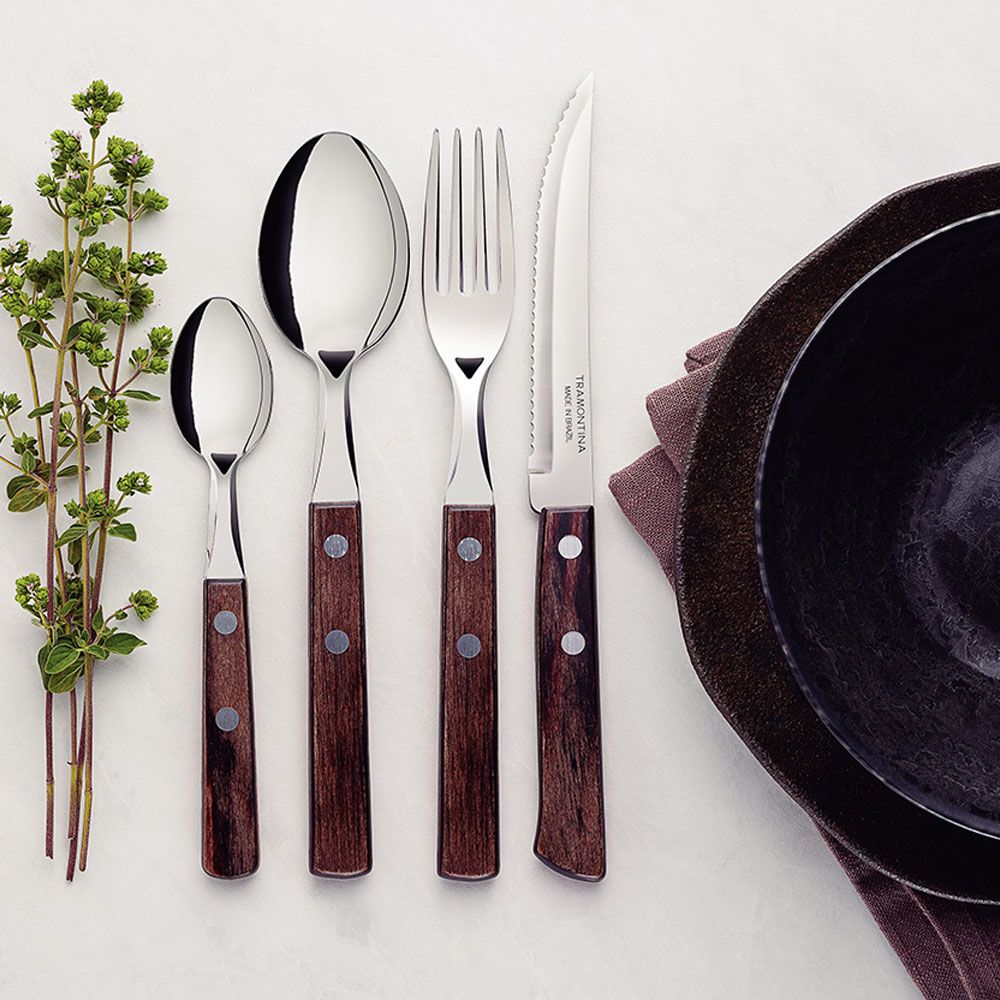 CUBERTERÍA 24 PIEZAS POLYWOOD CASTAÑO. DE ACERO INOXIDABLE CON MANGOS CASTAÑOS, DE MADERA, POLYWOOD
