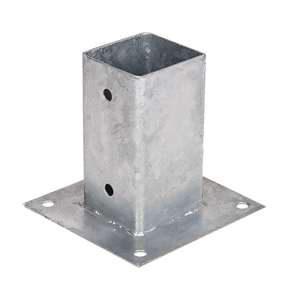 ANCLAJE CUADRADO DE ACERO GALVANIZADO CON UNAS MEDIDAS DE HUECO 7x7cm Y LA PARTE DE BASE 15x15cm CON DOS TALADROS PASANTES PARA SOPORTAR EL POSTE Y CUATRO TALADROS EN LA BASE FAURA