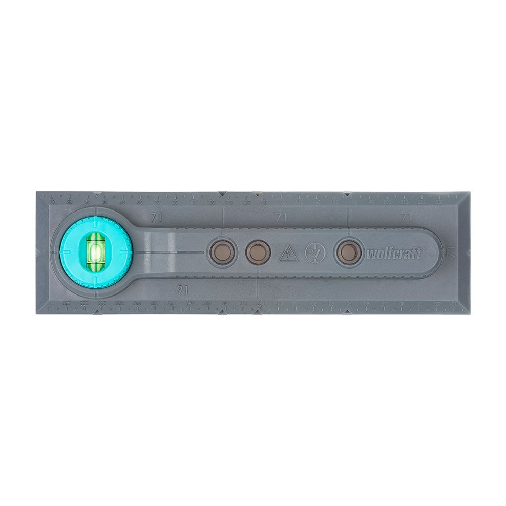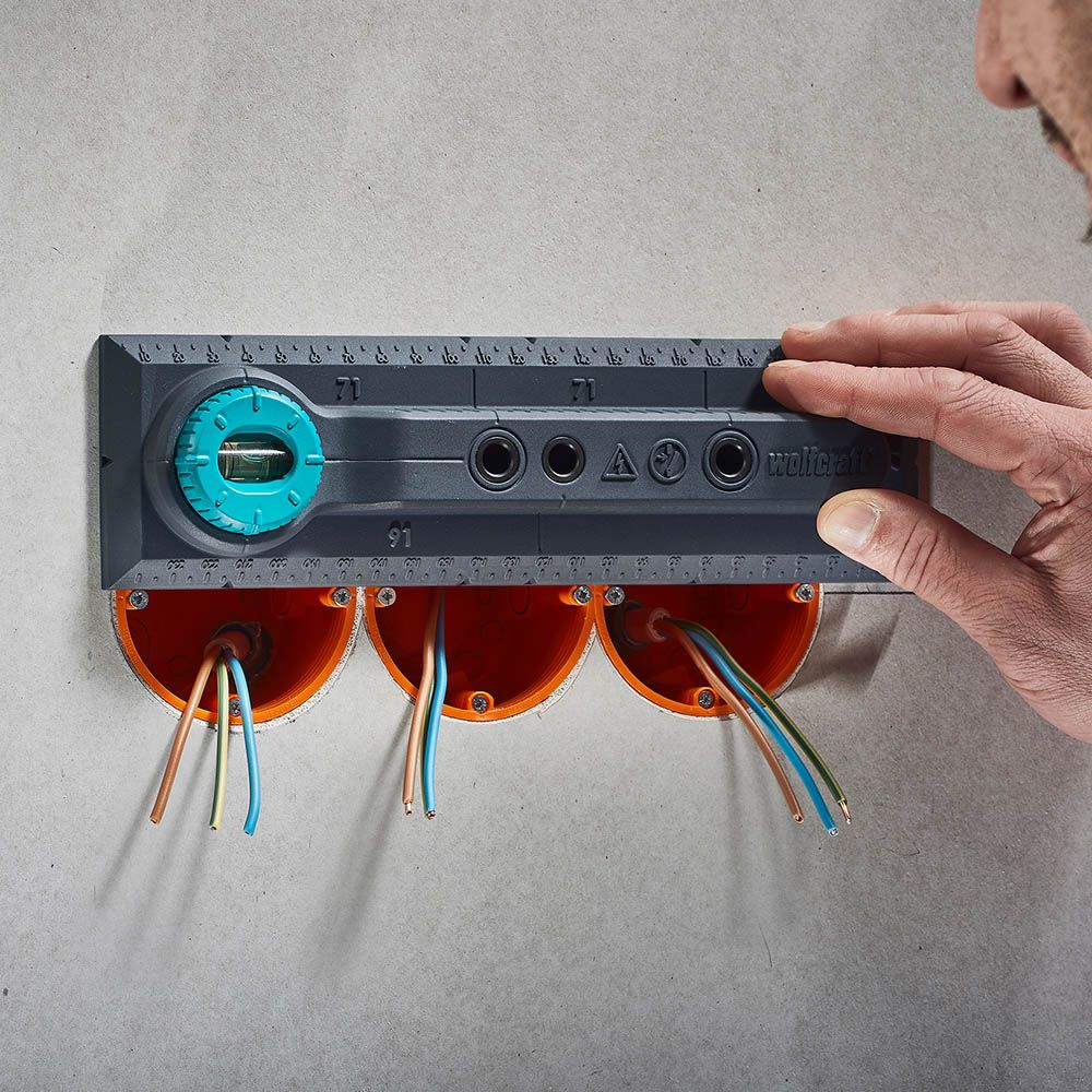 PLANTILLA DE PERFORACIÓN ELECTRICIDAD, PARA MEDIDAS DE 71 Y 91mm.PLANTILLA PARA MARCAR, ALINEAR Y TALADRAR PARA LA INSTALACIÓN DE INTERRUPTORES Y CAJAS DE ENCHUFE EN PAREDES DE LADRILLO.NIVEL DE BURBUJA CON GIRO DE 90° PARA UNA ALINEACIÓN HORIZONTAL Y VERTICAL DE LA PLANTILLA DE MARCADO PRECISO DE LA POSICIÓN DEL TALADRO Y PARA ALINEAR LAS CAJAS DE INSTALACIÓN Y LOS INSERTOS. MARCAS DE 71 Y 91mm PARA TRANSFERIR CÓMODAMENTE LAS DISTANCIAS CORRECTAS ENTRE DOS CAJAS DE INSTALACIÓN, ASÍ COMO CAJAS DE ENCHUFE Y CAJAS DE TV O RED. MANUAL DE INSTRUCCIONES PASO A PASO CON ILUSTRACIONES PARA EL USO CORRECTO DE LA PLANTILLA PARA UNA INSTALACIÓN CÓMODA Y SEGURA