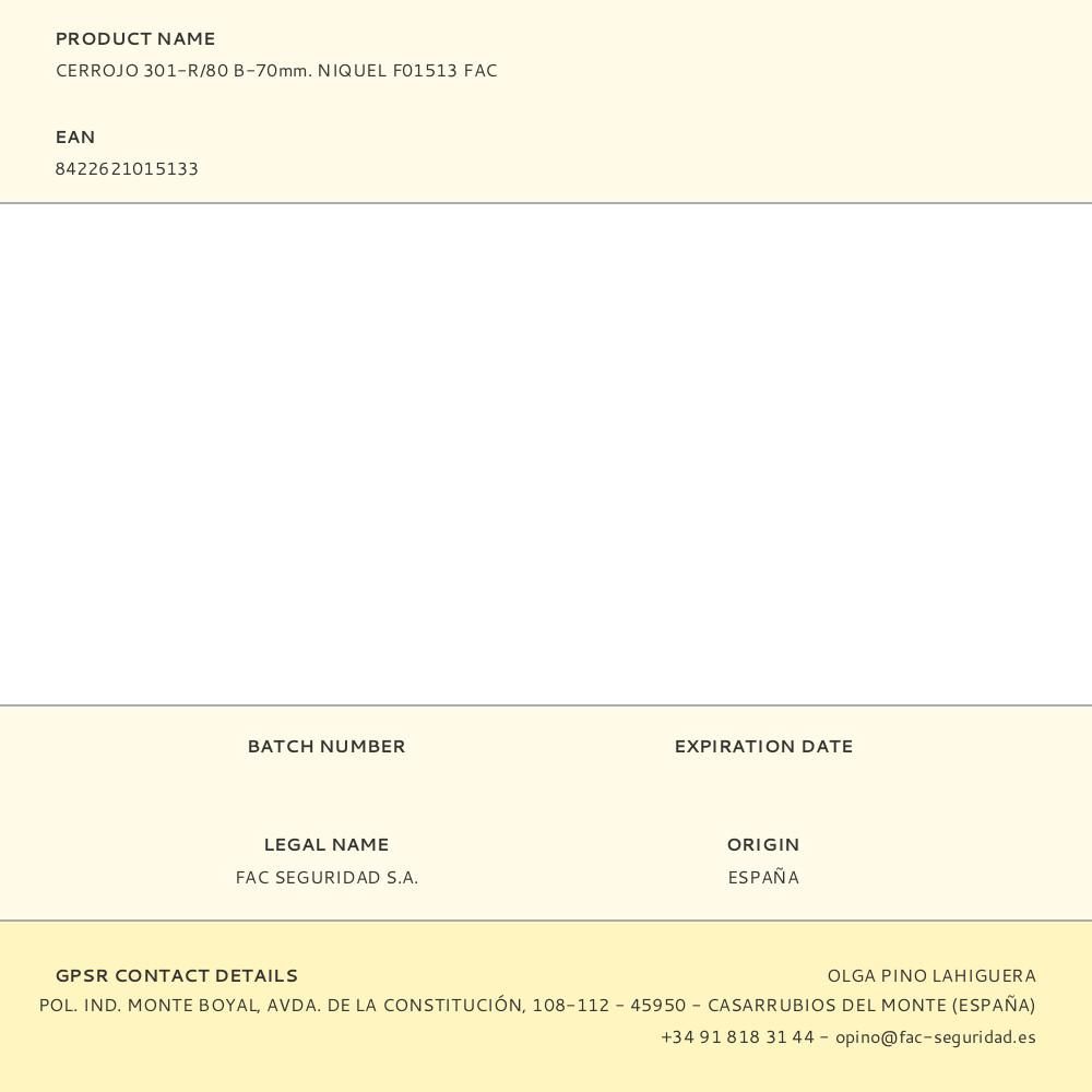 CERROJO 301-R/80 B-70mm. NIQUEL F01513 FAC CERROJO DE SEGURIDAD CON PLACA DE 80mm, BARRA DE 18mm Y CERRADERO DE 3mm DE ESPESOR. INDICADO PARA DIFERENTES USOS. CONTIENE 3 LLAVES DE SERRETA