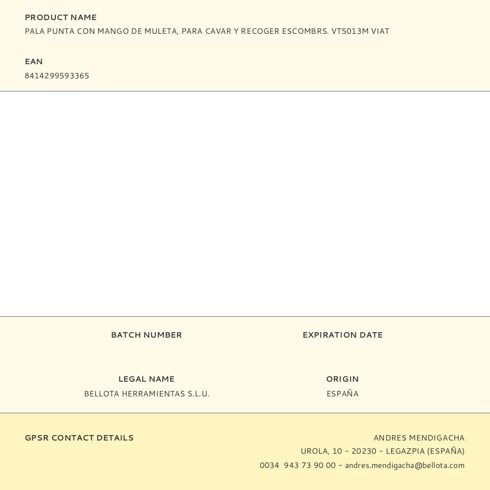 PALA PUNTA CON MANGO DE MULETA, PARA CAVAR Y RECOGER ESCOMBROS, CON PUNTA DE CHAPA DE ACERO, UNIÓN REFORZADA CON REMACHE, MANGO MULETA DE MADERA, PARA CAVAR Y RECOGER ESCOMBRO, DIMENSIONES 290 x 1030 x 150 mm. PESO 1,77 kg