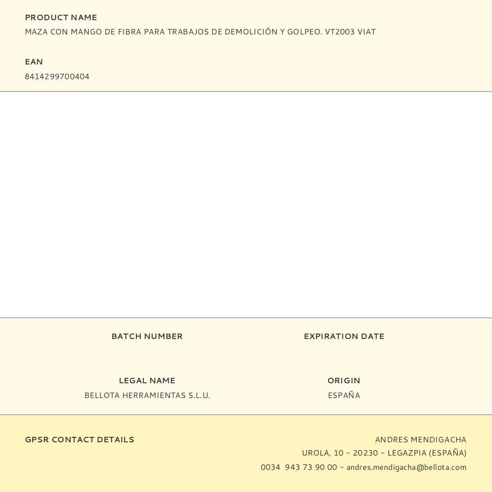 MAZA CON CABEZA DE ACERO FORJADO, ENDURECIDO EN LAS ZONAS DE GOLPEO, MANGO BIMATERIAL CON NÚCLEO DE FIBRA DE VIDRIO PARA MAYOR RESISTENCIA Y AGARRE DE ELASTÓMERO, UNIÓN CÓNICA, PARA TRABAJOS DE DEMOLICIÓN Y GOLPEO, DIMENSIONES 143 x 910 x 60 mm. PESO 3,5 kg