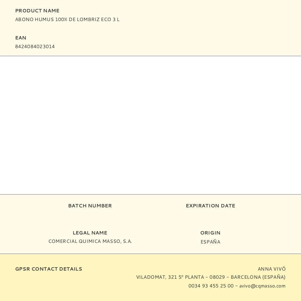 ABONO HUMUS 100% DE LOMBRIZ ECO 3 L. SUSTRATO RICO Y NATURAL 100% PURO DE LOMBRIZ. MEJORA LA RETENCIÓN DEL AGUA, EVITA EL SHOCK DEL TRASPLANTE, MEJORA LA ASIMILACIÓN DE LOS ABONOS MINERALES. SIN OLOR. FERTILIZANTE NATURAL, ECOLÓGICO Y BIO-ORGÁNICO. MASSÓ