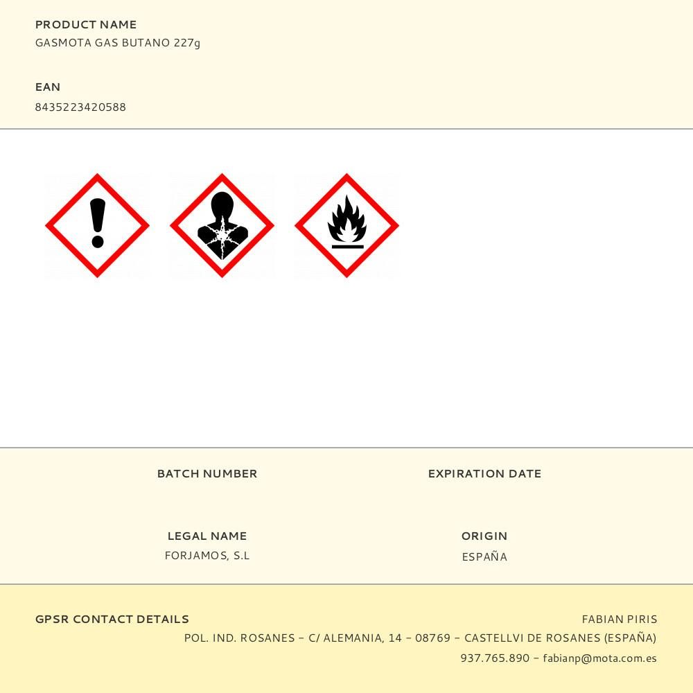 GASMOTA GAS BUTANO 227 g CARTUCHO DE GAS BUTANO IDEAL PARA TODO TIPO DE COCINA Y SOPLETE COMPATIBLE. CON DOBLE VÁLVULA DE SEGURIDAD.
