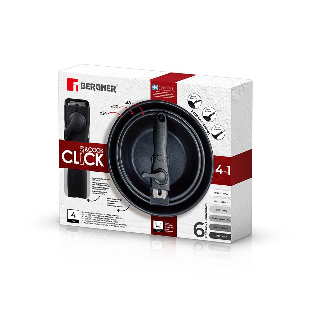 SET 3 SARTENES ACERO INOXIDABLE CLICK & COOK BERGNER. JUEGO DE 3 SARTÉNES DE ACERO INOXIDABLE. 1 SARTÉN Ø18x6cm, 1 SARTÉN Ø20x6.0cm, 1 SARTÉN Ø24x6.5cm CON 1 MANGO DESMONTABLE DE BAQUELITA. APTAS PARA LA INDUCCIÓN