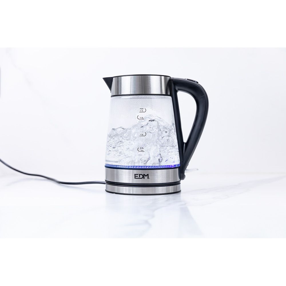 HERVIDOR DE AGUA DE CRISTAL + ACERO INOXIDABLE 1,7 LITROS 1850 - 2200W EDM. APAGADO AUTOMÁTICO. PROTECCIÓN CONTRA USO EN VACÍO. INTERRUPTOR DE ENCENDIDO/APAGADO CON LUZ LED. DIMENSIONES: Ø17x22x24,5cm (diámetro/ancho/alto)