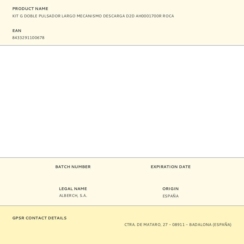 KIT G DOBLE PULSADOR LARGO MECANISMO DESCARGA D2D AH0001700R ROCA KIT G DOBLE PULSADOR LARGO PARA MECANISMO DE DESCARGA D2D. DIMENSIONES: 380x520x420mm (ancho/fondo/alto)
