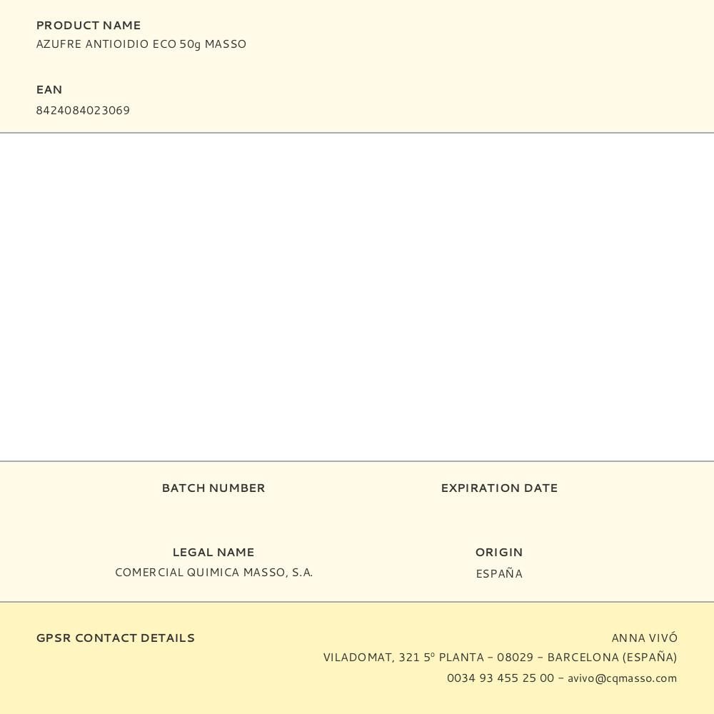 AZUFRE ANTIOÍDIO ECO 50 g. FUNGICIDA-ACARICIDA AUTORIZADO EN AGRICULTURA ECOLÓGICA. CONTRA OIDIO Y ARAÑA ROJA EN TODO TIPO DE PLANTAS: ARBUSTOS, ORNAMENTALES, FRUTALES, HORTÍCOLAS, VID Y OLIVOS. GRÁNULOS DISPERSABLES EN AGUA. PREVENTIVO Y CURATIVO