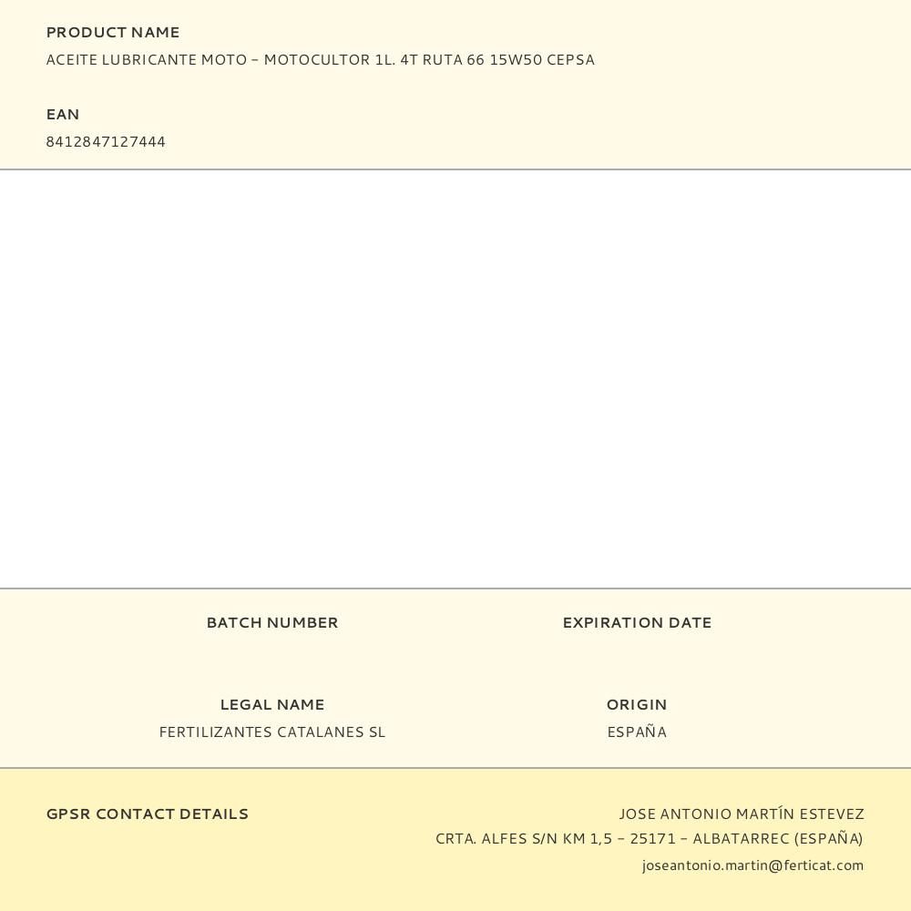 ACEITE LUBRICANTE MOTO - MOTOCULTOR 1L. 4T RUTA 66 15W50 CEPSA