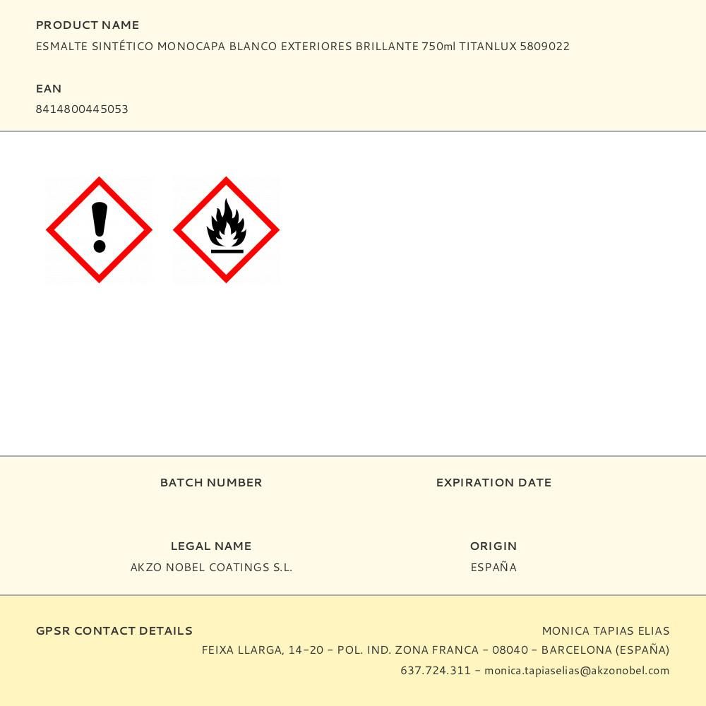 ESMALTE SINTÉTICO MONOCAPA BRILLANTE BLANCO EXTERIORES 750 ml BASADO EN TECNOLOGÍA DE ALTOS SÓLIDOS, DE SECADO RÁPIDO Y USO UNIVERSAL. MUY BRILLANTE Y ELÁSTICO, CON UNA EXCELENTE ESTABILIDAD DE COLOR Y BRILLO, Y UNA GRAN RESISTENCIA AL RAYADO. MUY BUENA NIVELACIÓN Y CUBRICIÓN DE CANTOS. RESISTENTE A LA INTEMPERIE, GRASAS, LAVADOS, ETC