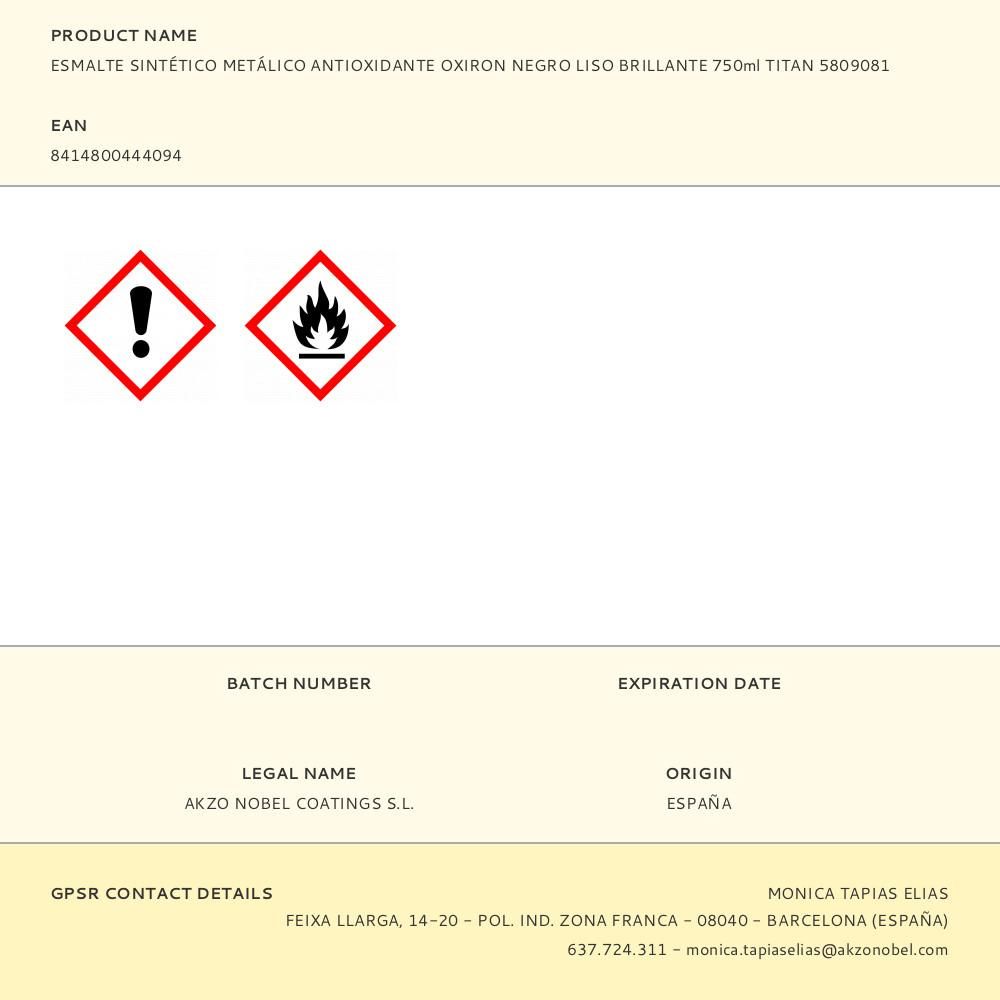 ESMALTE SINTÉTICO METÁLICO ANTIOXIDANTE NEGRO LISO BRILLANTE 750 ml DE SECADO RÁPIDO DE APLICACIÓN DIRECTA SOBRE ACERO Y ÓXIDO, SIN NECESIDAD DE IMPRIMACIÓN PREVIA. PROPORCIONA UNA EXCELENTE RESISTENCIA A LA INTEMPERIE DE HASTA 10 AÑOS Y UN ACABADO DE ALTO BRILLO, DE GRAN ADHERENCIA, DUREZA Y RESISTENCIA A LOS GOLPES Y ARAÑAZOS. SE PUEDE REPINTAR A PARTIR DE 2 HORAS
