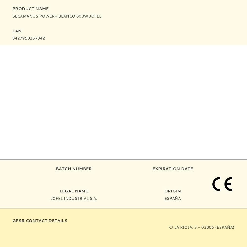 SECAMANOS POWER+ BLANCO 800W JOFEL