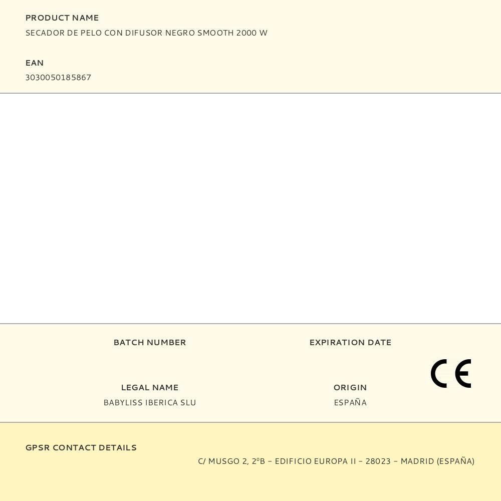 SECADOR 2000W CON DIFUSOR NEGRO SMOOTH D215DE BABYLISS. 2 VELOCIDADES, 2 TEMPERATURAS MÁS BOTÓN DE AIRE FRÍO. PESO LIGERO 409g COLOR NEGRO MATE. FLUJO DE AIRE 91km/h.TECNOLOGÍA IÓNICA: NEUTRALIZA LA ELECTRICIDAD ESTÁTICA.