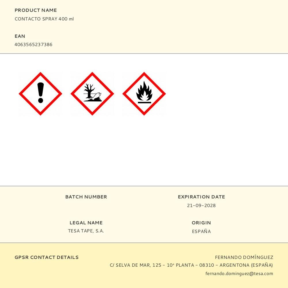 CONTACTO SPRAY 400 ml. PEGA CON LA MÁXIMA RESISTENCIA, SIN PERDER FLEXIBILIDAD, MATERIALES MUY DIVERSOS, CORCHO, MADERA, MOQUETAS, FIBRA DE VIDRIO, FIELTRO, ESTRATIFICADOS (FÓRMICA), GOMA, CAUCHO, PLÁSTICOS, BALDOSAS, CUERO, TEJIDOS, PAPEL, CARTÓN, ESPUMA DE POLIURETANO, LÁMINAS METÁLICAS DELGADAS, PLACAS DE POLIÉSTER, ESPUMAS BLANDAS Y RÍGIDAS, ETC. RESISTENTE A LA TEMPERATURA: + 80°C