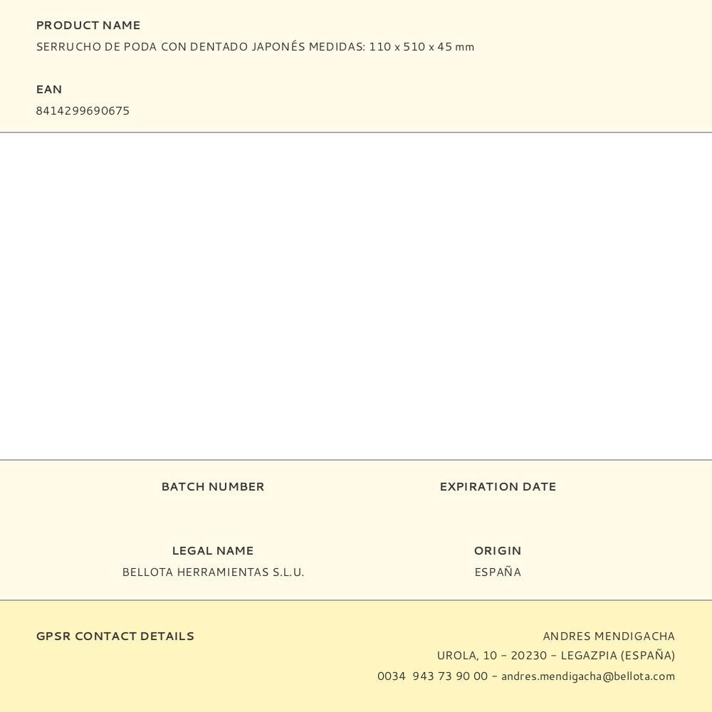 SERRUCHO DE PODA CON DENTADO JAPONÉS MEDIDAS: 110 x 510 x 45 mm