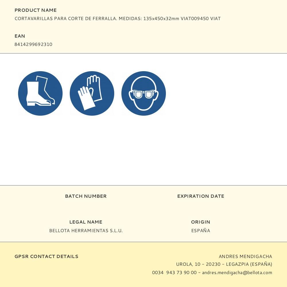 CORTAVARILLAS PARA CORTE DE FERRALLA. MEDIDAS: 135 x 450 x 32 mm, CON CUCHILLAS FORJADAS EN UNA SOLA PIEZA Y FILOS TEMPLADOS POR INDUCCIÓN PARA UNA MAYOR RESISTENCIA AL DESGASTE. MANGO CERRADO PARA FACILITAR EL CORTE. PARA TRABAJOS DE CORTAR FERRALLA