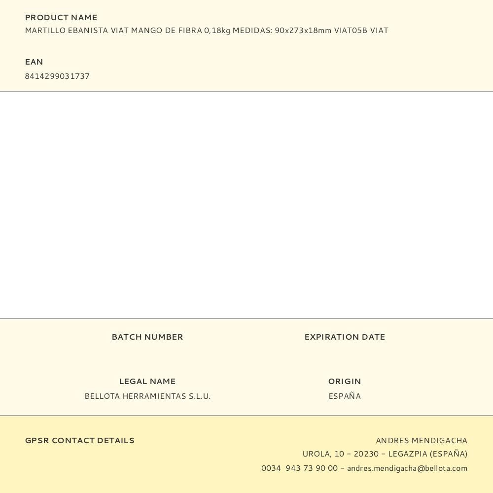 MARTILLO EBANISTA VIAT MANGO DE FIBRA 0,18 kg MEDIDAS: 90 x 273 x 18 mm, CON CABEZA DE ACERO FORJADO, ENDURECIDO EN LAS ZONAS DE GOLPEO. MANGO BIMATERIAL CON NÚCLEO DE FIBRA DE VIDRIO PARA MAYOR RESISTENCIA Y AGARRE DE ELASTÓMERO. UNIÓN MEDIANTE RESINA EPOXI. PARA TRABAJOS DE EBANISTERÍA