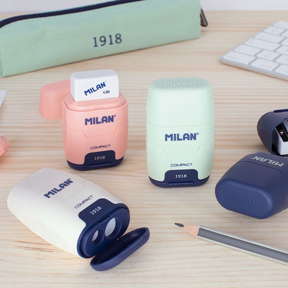BLISTER AFILABORRA COMPACT SERIE 1918 AZUL + 2 GOMAS DE RECAMBIO MILAN. COMBINACIÓN DE GOMA DE BORRAR Y SACAPUNTAS DOBLE (UNO ESTÁNDAR Y OTRO MAXI) CON DEPÓSITO. DISEÑO COMPACT, SERIE 1918, COLOR AZUL. GOMA CUADRADA SUAVE DE CAUCHO SINTÉTICO TIPO 'MIGA DE PAN'. EL SACAPUNTAS DISPONE DE UNA CUCHILLA DE ACERO AFILADA Y RESISTENTE, IDEAL PARA TODO TIPO DE LÁPICES. SACAPUNTAS CON CUCHILLA DE SEGURIDAD: ESTE SISTEMA EVITA QUE SE PUEDA SEPARAR LA HOJA DEL CUERPO DEL SACAPUNTAS. DISEÑO ORIGINAL CREADO POR EL PROPIO DEPARTAMENTO DE I+D DE MILAN. INCLUYE 2 GOMAS DE BORRAR 430 DE RECAMBIO.