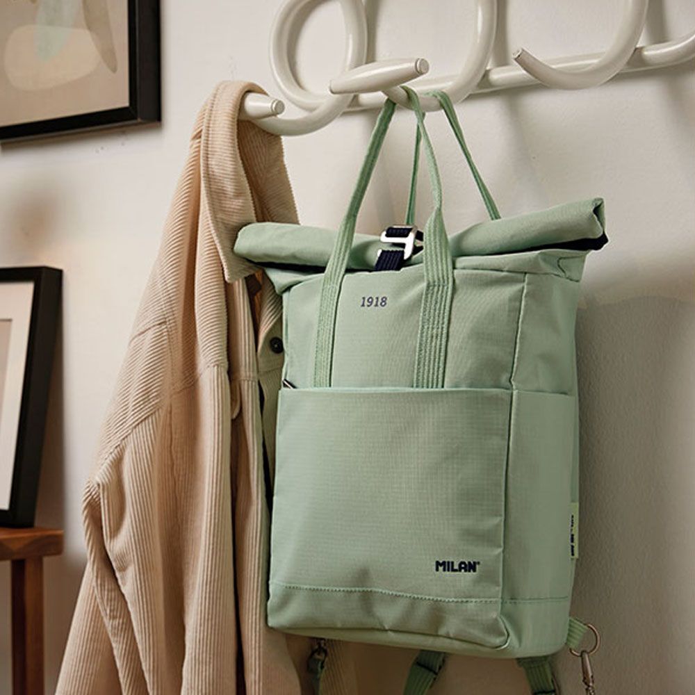 MOCHILA URBANA CON CIERRE SUPERIOR ENROLLABLE 10 L. SERIE 1918, VERDE. MOCHILA URBANA CON CIERRE SUPERIOR ENROLLABLE QUE PERMITE AJUSTAR SU CAPACIDAD AL CONTENIDO. SERIE 1918, COLOR VERDE CON DETALLES AZUL MARINO. INSPIRADA EN LOS COLORES Y DISEÑO ORIGINALES DE LAS GOMAS DE BORRAR MILAN, FABRICADAS EN ESPAÑA DESDE 1918, CIERRE SUPERIOR CON CREMALLERA Y CORREA AJUSTABLE CON HEBILLA METÁLICA. BOLSILLO FRONTAL CON CREMALLERA. 2 BOLSILLOS LATERALES DE FÁCIL ACCESO. BOLSILLO TRASERO ACOLCHADO Y CON FORRO DE TERCIOPELO, QUE PROTEGE LAS PANTALLAS Y CONTENIDO DE POSIBLES RASGADURAS. ASAS REGULABLES QUE SE PUEDEN RECOGER DENTRO DEL COMPARTIMENTO POSTERIOR, CONVIRTIENDO LA MOCHILA EN BOLSO. FORRO INTERIOR ESTAMPADO AZUL MARINO CON UNA CUADRÍCULA QUE EVOCA LAS FORMAS DE LAS GOMAS MILAN. TEJIDO EXT...