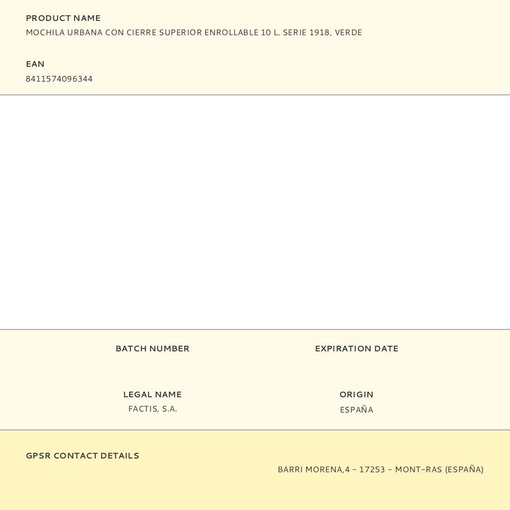 MOCHILA URBANA CON CIERRE SUPERIOR ENROLLABLE 10 L. SERIE 1918, VERDE