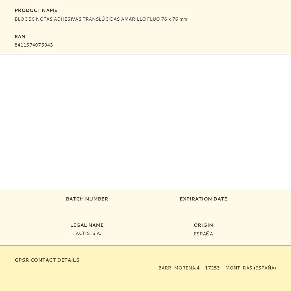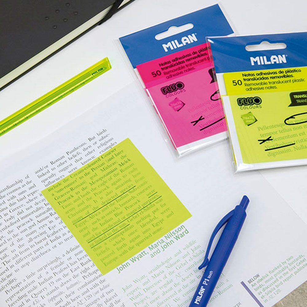 BLOC 50 NOTAS ADHESIVAS TRANSLÚCIDAS AMARILLO FLUO 76x76mm MILAN. NOTAS ADHESIVAS DE PLÁSTICO TRANSLÚCIDAS Y REMOVIBLES. PERMITEN ESCRIBIRFÁCILMENTE Y HACER ANOTACIONES CON LÁPIZ O BOLÍGRAFO. COLOR AMARILLO FLUO TRANSLÚCIDO. 76x76mm.