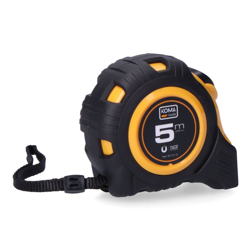 FLEXÓMETRO 5 m x 25 mm. CUERPO FABRICADO EN ABS ANTIDESLIZANTE. GANCHO MAGNÉTICO. UNA POSICIÓN DE BLOQUEO Y SISTEMA AUTO LOCK. CLIP PARA CINTURÓN. GROSOR DE LA CINTA 0,115mm, CINTA NUMERACIÓN AMARILLA ACABADO MATE
