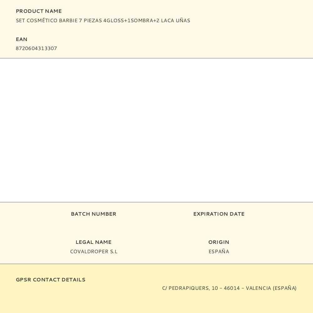 SET COSMÉTICO BARBIE 7 PIEZAS 4GLOSS+1SOMBRA+2 LACA UÑAS
