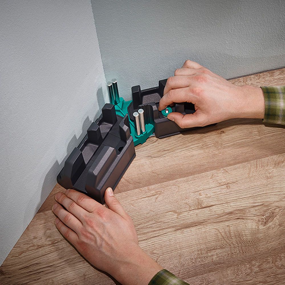 CAJA DE INGLETAR Y FALSA ESCUADRA, ESTE SOPORTE 2 EN 1 FACILITA MEDIR Y SERRAR INGLETES PRECISOS PARA RODAPIÉS. ELIMINA LA NECESIDAD DE FALSAS ESCUADRAS Y TRANSFIERE ÁNGULOS A LA SIERRA. PERMITE MEDIR ESQUINAS DE 85° A 180°, GARANTIZANDO RODAPIÉS AJUSTADOS. LA BISECTRIZ AUTOMÁTICA FACILITA LOS CORTES CON UN SERRUCHO DE COSTILLA. ASEGURA TRANSICIONES PERFECTAS EN ESQUINAS, INCLUSO EN EDIFICIOS ANTIGUOS