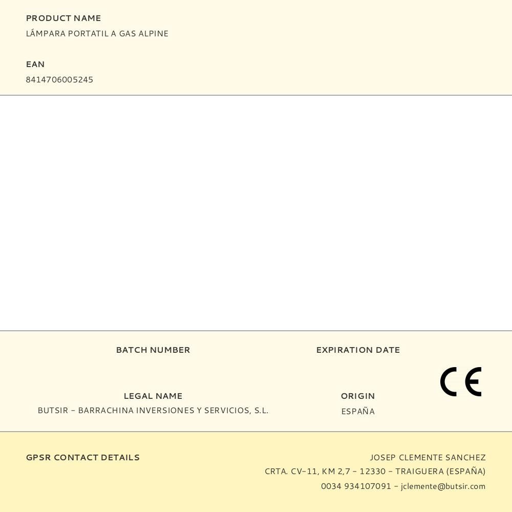 LÁMPARA PORTATIL ALPINE A CARTUCHO 190g. ENCENDIDO PIEZOELECTRICO, INCLUYE UNA CAMISA - CONSUMO 80g/h PESO 0,65kg