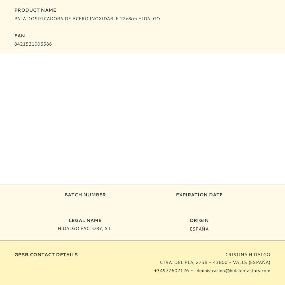 PALA DOSIFICADORA DE ACERO INOXIDABLE HIDALGO. MEDIDAS: 22 x 8 x 5 cm