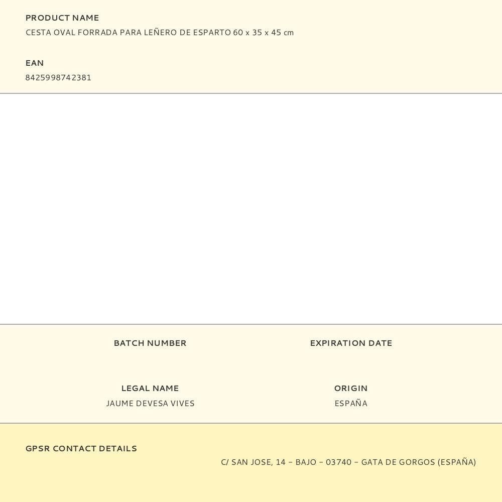CESTA OVAL FORRADA PARA LEÑERO DE ESPARTO, 60 x 35 x 45 cm