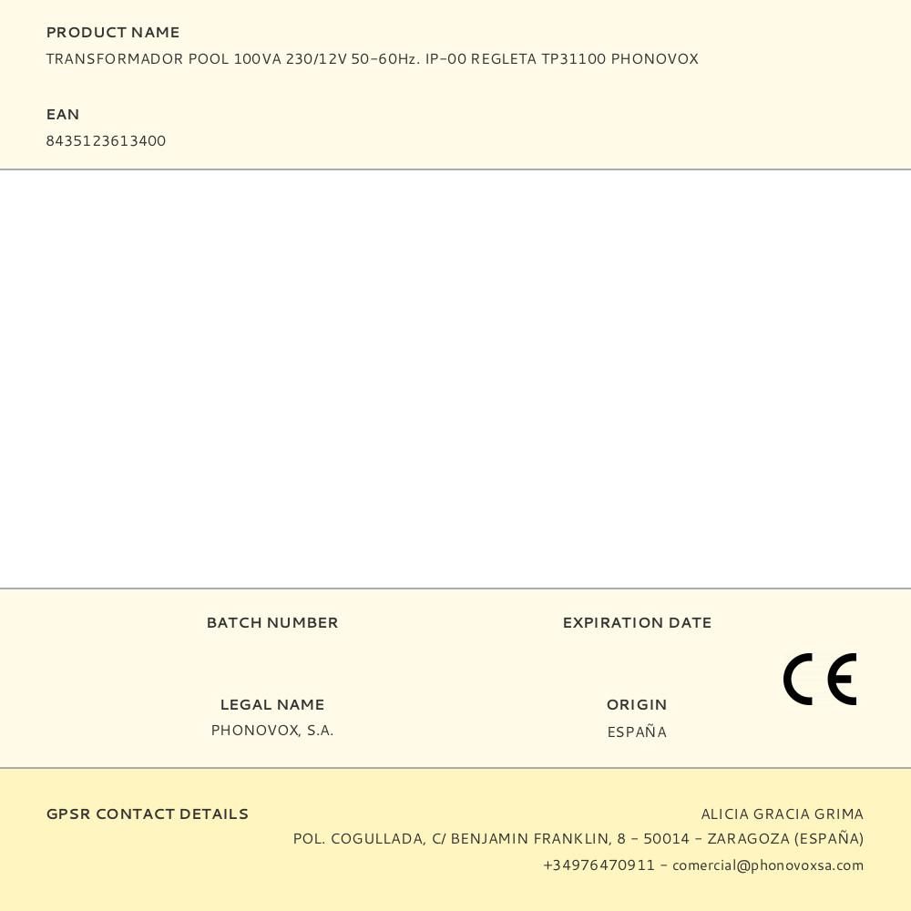 TRANSFORMADOR POOL 100VA 230/12V 50-60Hz. IP-00 REGLETA TP31100. TRANSFORMADOR DE SEGURIDAD PARA ALIMENTACIÓN DE FOCOS SUBACUÁTICOS DE 12VAC ( PISCINAS). POTENCIA NOMINAL 100VA, CARGA DE HASTA 70W DE FOCOS LED Ó 100W DE FOCOS INCANDESCENTES. CARCASA PLÁSTICA DE POLIAMIDA, ENCAPSULADO EN RESINA DE POLIURETANO, CLASE II, NORMA IEC61558, CONEXIÓN POR REGLETA DE TORNILLOS, INDICE DE PROTECCIÓN IP-00. USO INTERIOR. PESO UNITARIO: 1,50 kg. MEDIDAS: 98 x 79 x 74 mm