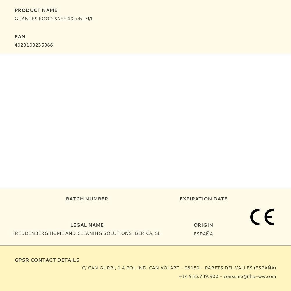 GUANTES FOOD SAFE 40 unid. M/L. MÁXIMA PROTECCIÓN PARA TUS MANOS SENSIBLES DENTRO Y FUERA DEL HOGAR. GUANTES DESECHABLES 100% DE NITRILO PARA UNA PROTECCIÓN IDEAL EN MÚLTIPLES TAREAS. GUANTES ESPECIALMENTE RECOMENDADOS PARA EL CONTACTO CON ALIMENTOS.