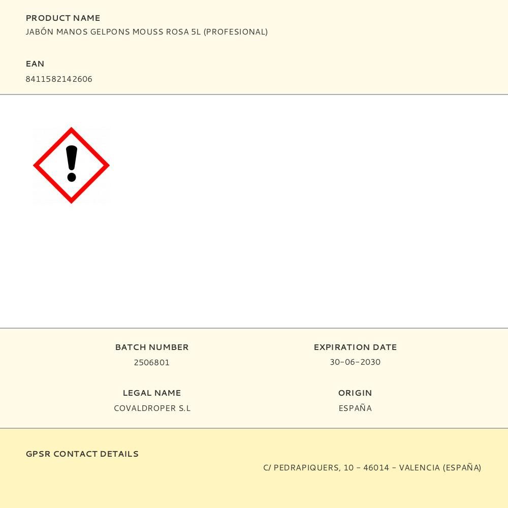 JABÓN MANOS GELPONS MOUSS ROSA 5L (PROFESIONAL). IDEAL PARA EL USO EN DOSIFICADORES RELLENABLES.