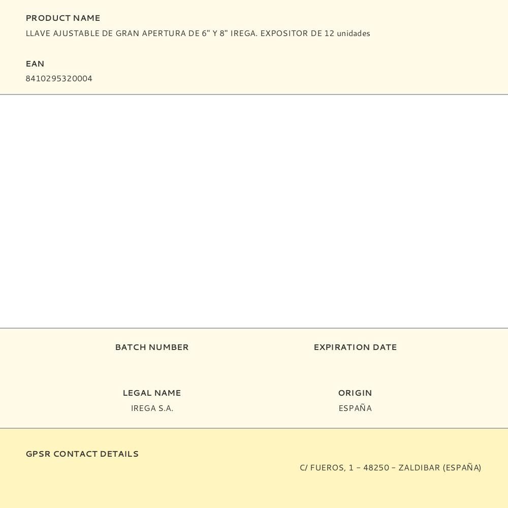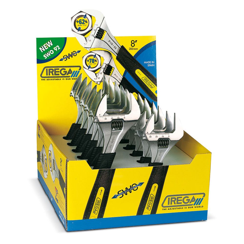 EXPOSITOR DE 12 LLAVES AJUSTABLES DE GRAN APERTURA DE 6 Y 8 pulgadas, CONTIENE: 6 unid. SWO 6 pulg (APERTURA 34 mm) 6 unid. SWO 8 pulg (APERTURA 39 mm) MADE IN SPADREN